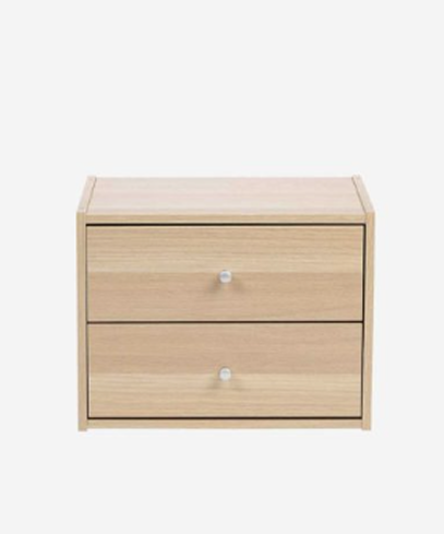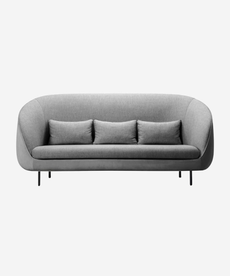 O sofá apresenta um formato amplo e angular, com uma estrutura em madeira e aço, suportada por uma estrutura esbelta em aço com pintura eletrostática. Uma almofada por unidade está incluída. Esta versão é um sofá de 3 lugares com estofos em cinza claro ou cinza escuro.